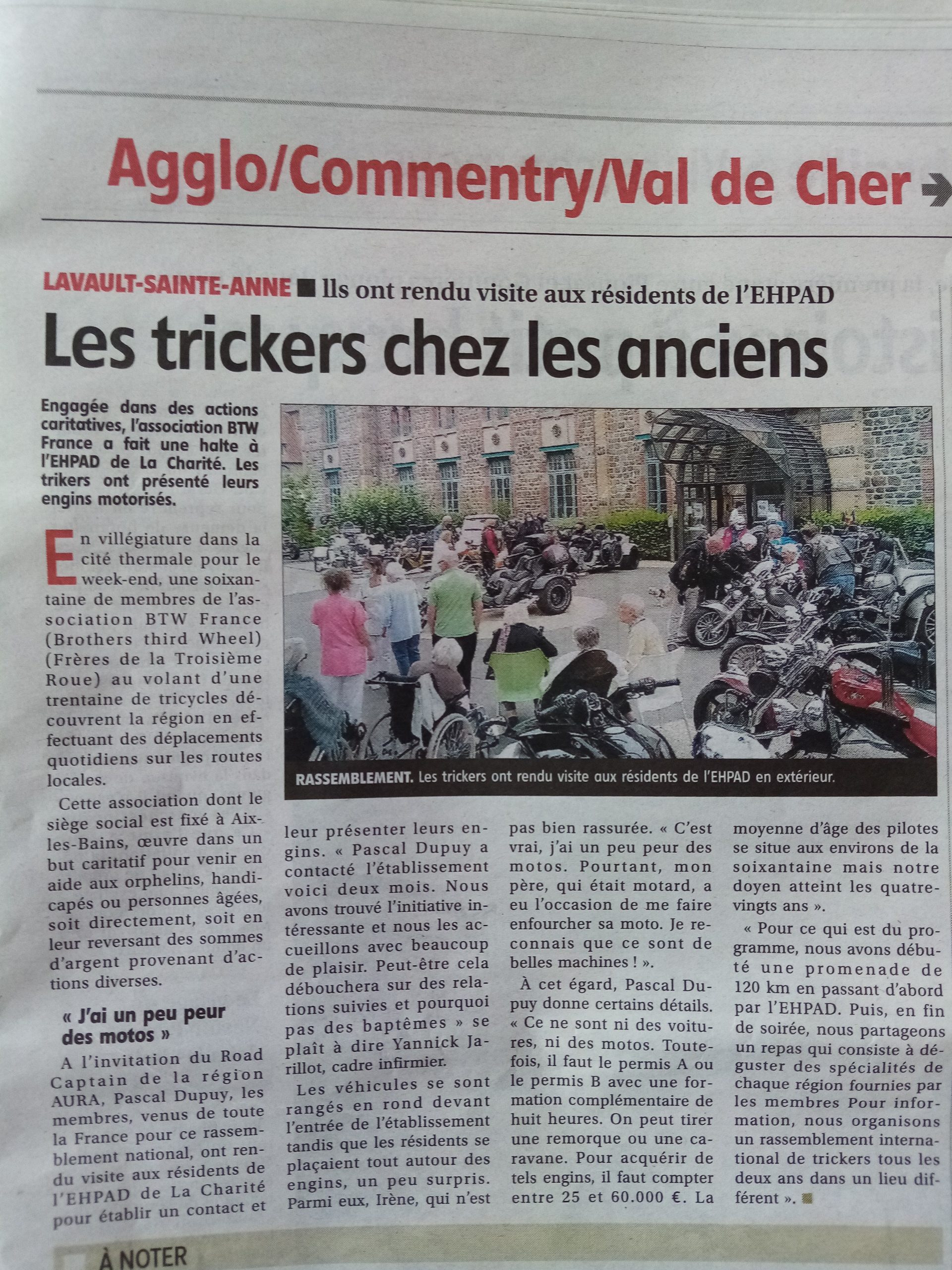Samedi 31 juillet, les membres d’une association de trickes sont venus devant l’EHPAD. Ils y ont fait une halte lors d’un rallye en terres bourbonnaises. Les résidents ont été ravis d’admirer les grosses cylindrées et d’échanger avec les motards au grand coeur. Quelques images de l’après-midi et l’article de journal paru dans La Montagne ce mercredi 4 août 2021.