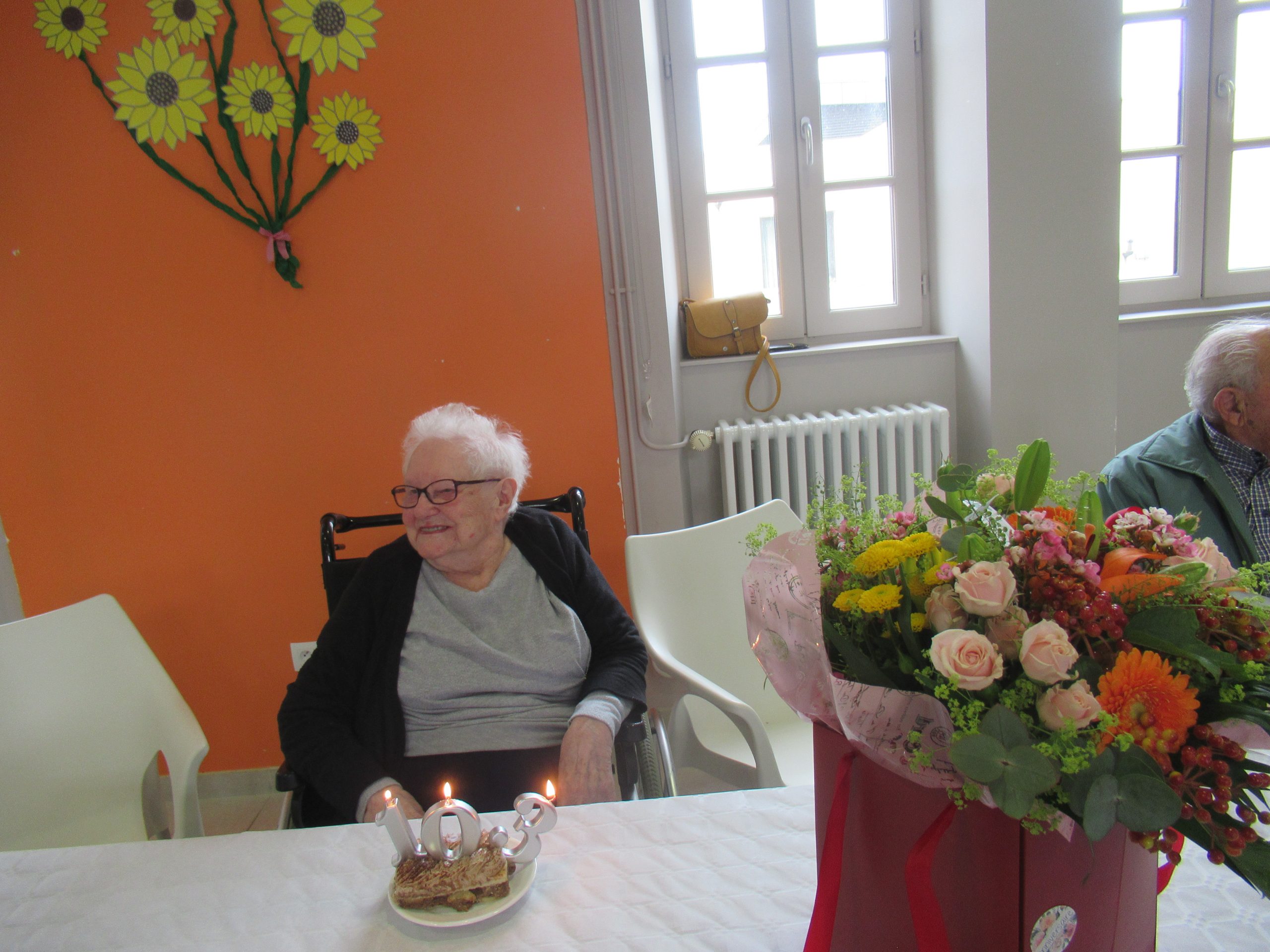 La présence était d’autant plus importante pour notre doyenne, Mme Neyrat. Elle a fêté le 20 juillet dernier ses 103 ans et ce mardi 3 août, c’est entourée de 2 de ses filles qu’elle a reçu des mains de notre directeur un bouquet pour fêter sa longévité.