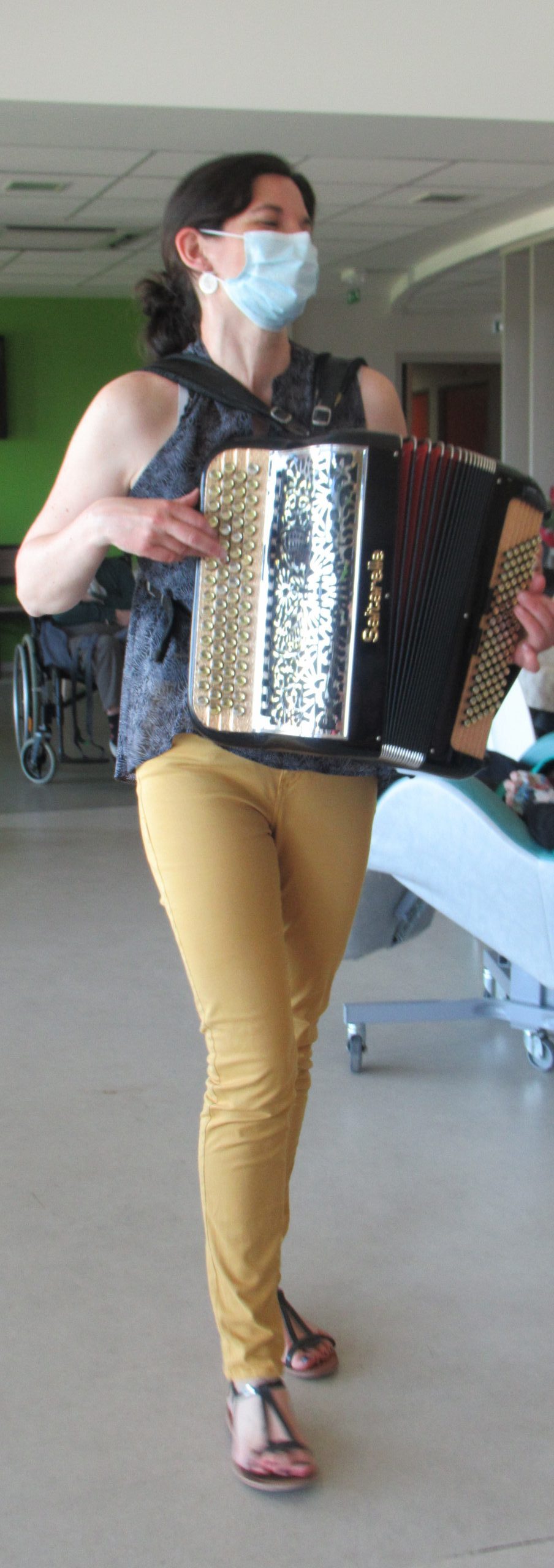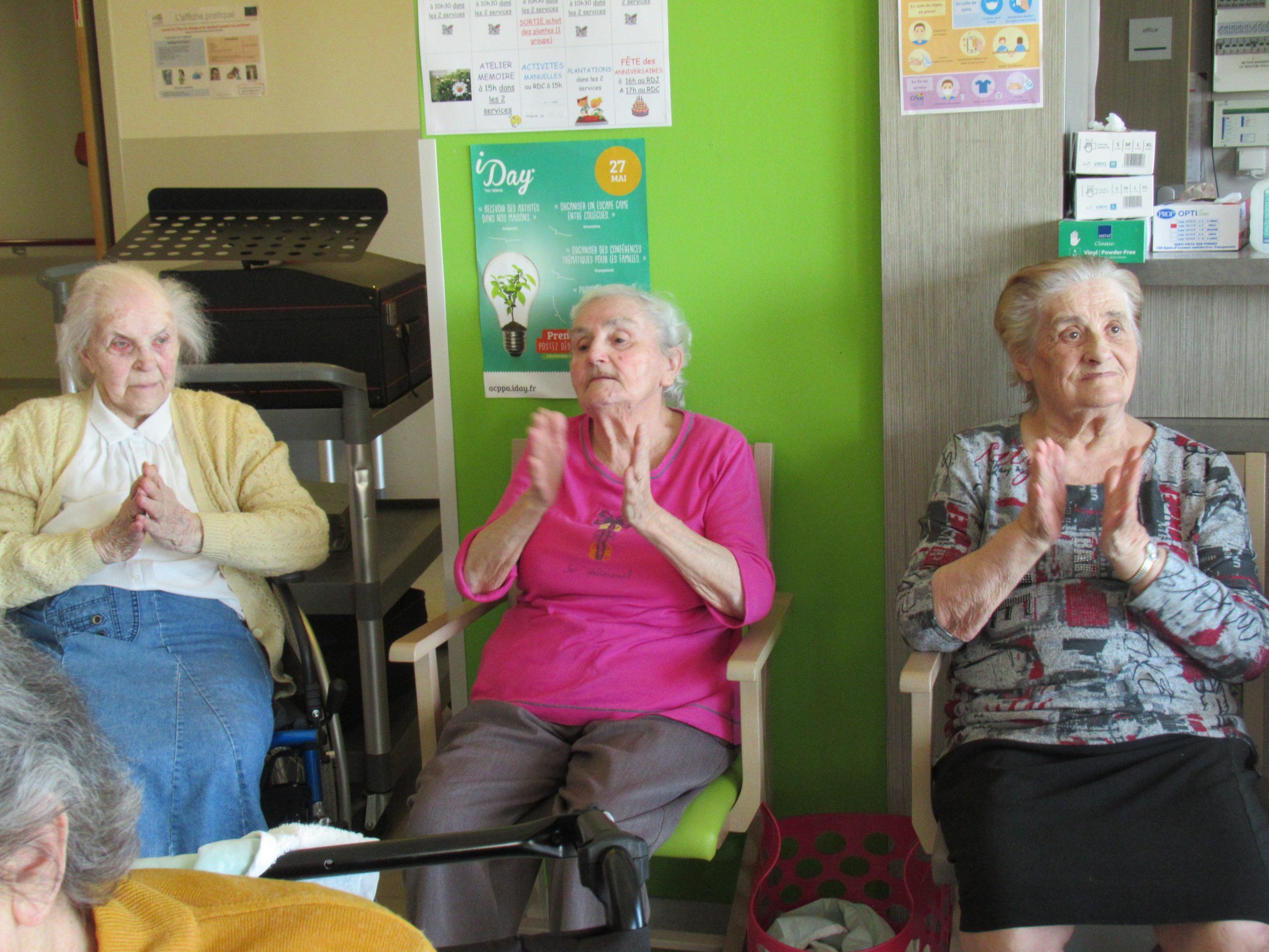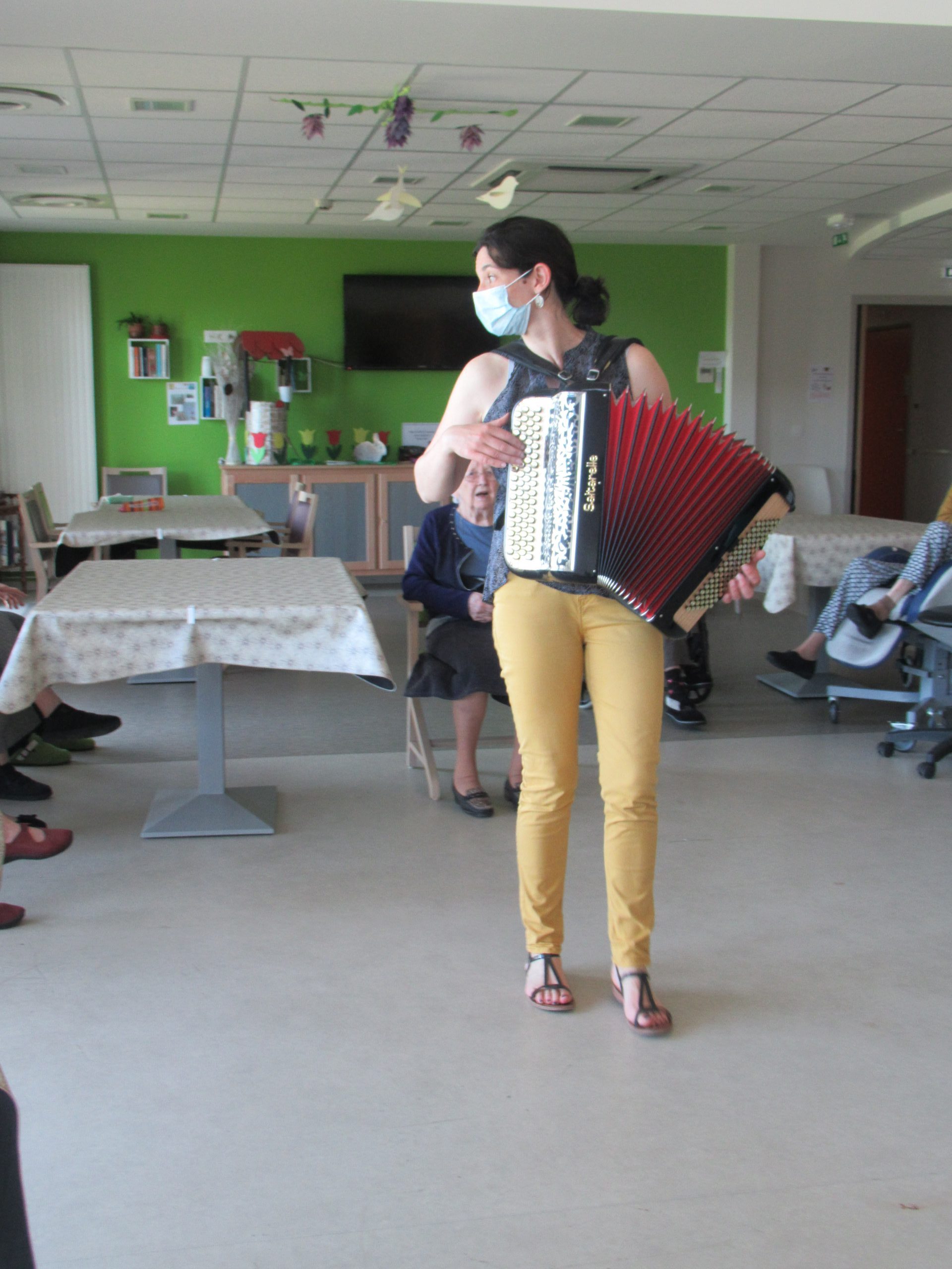 Côté musique, la tâche a été confiée ce mois-ci à une jeune accordéoniste, Cathy Penot. Son énergie et sa bonne humeur ont vite entraîné résidents et personnels sur la piste de danse. La musicienne a également proposé aux spectateurs quelques petits jeux de rythmiques : taper des mains en rythme, taper du pied lors d’une bourrée endiablée, etc…