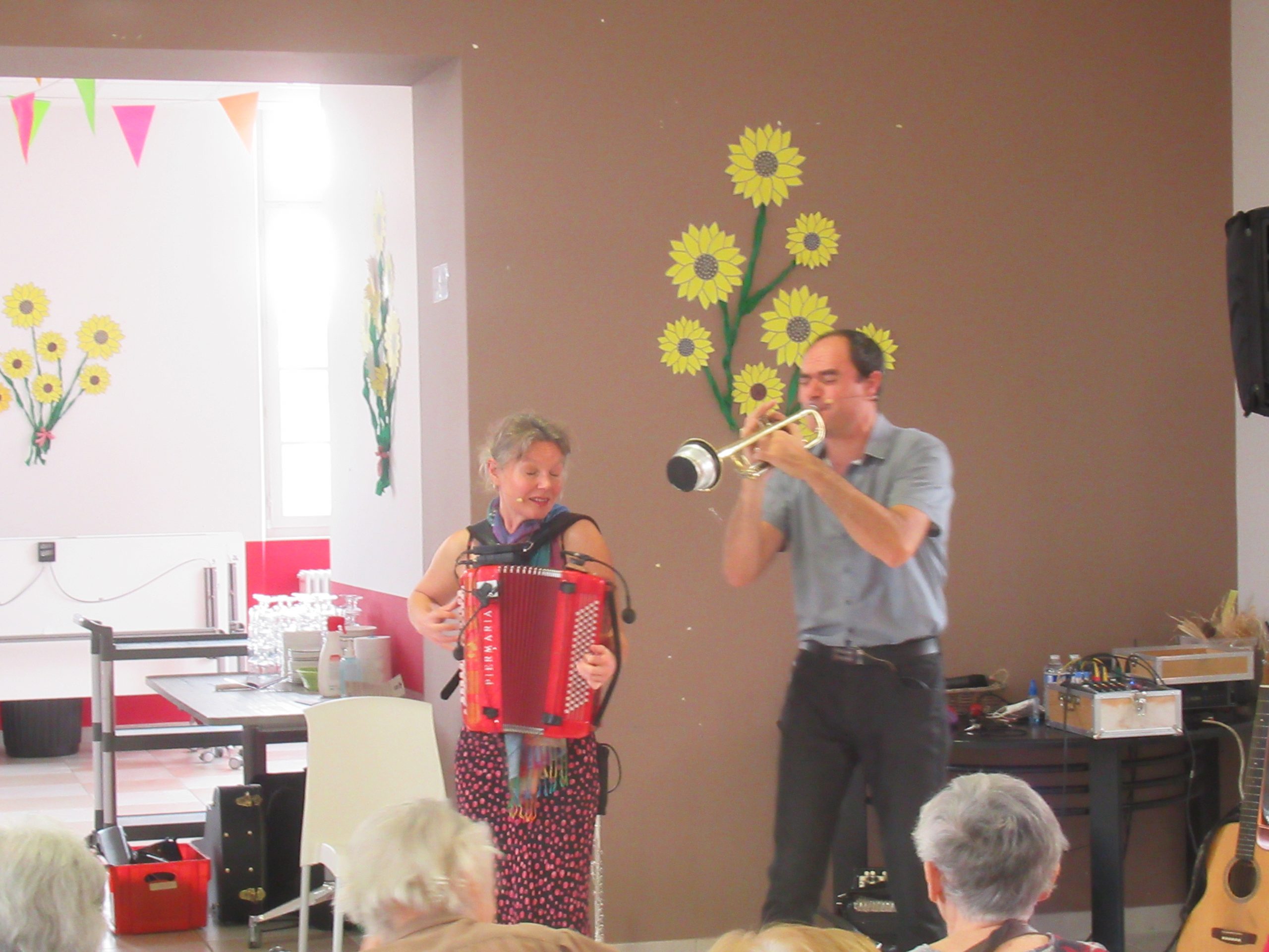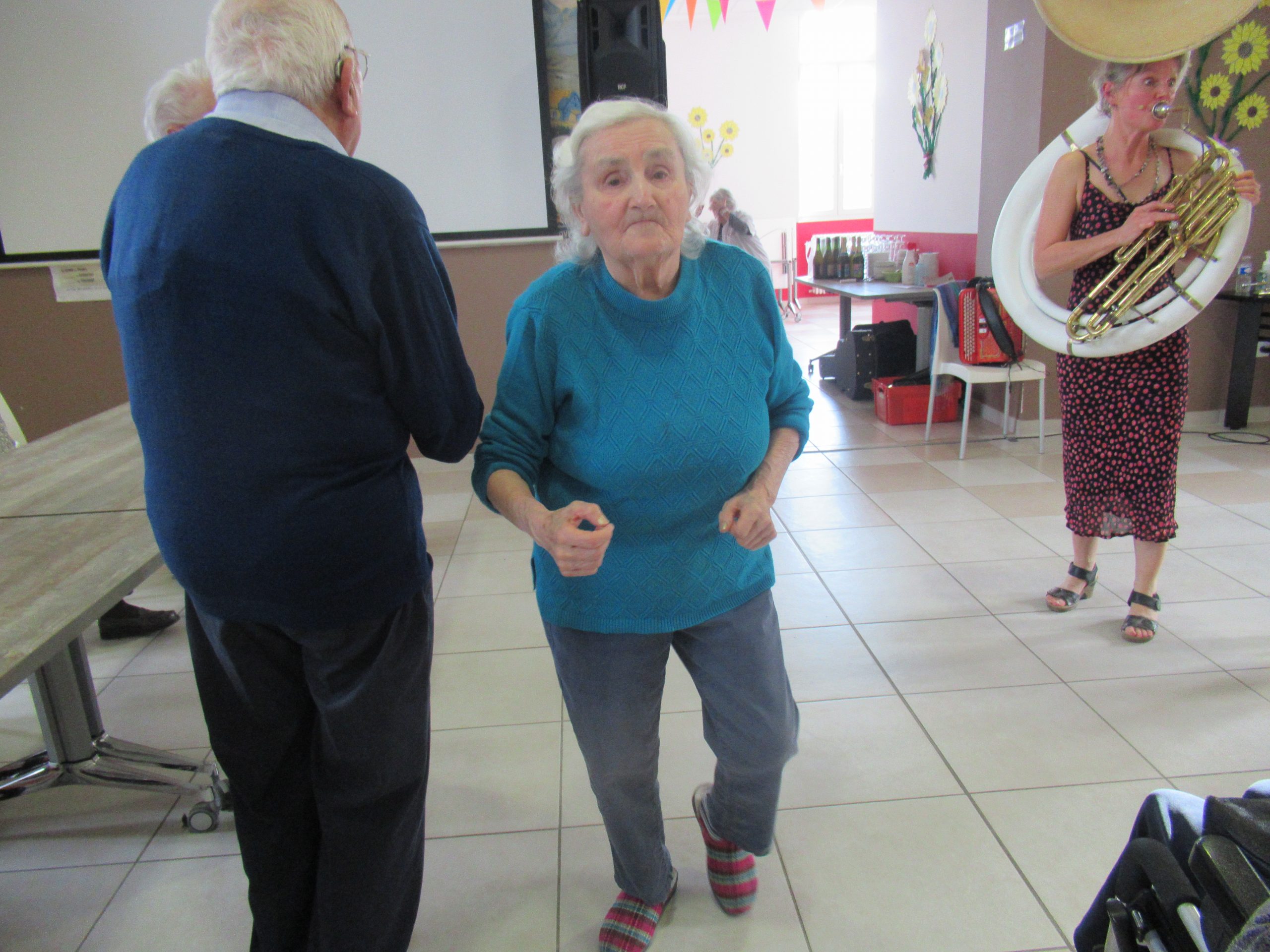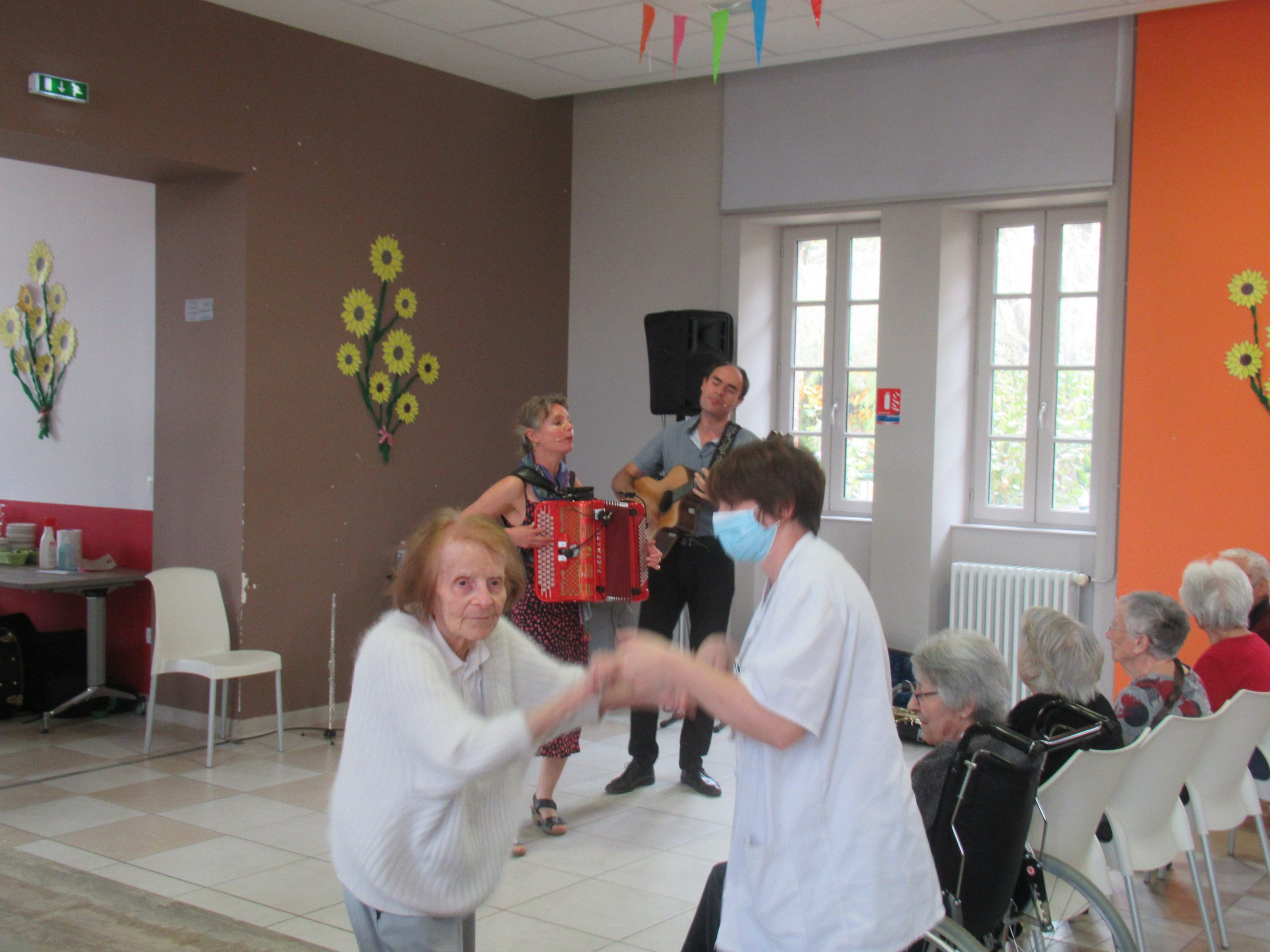 Le vendredi 29 octobre avait lieu la fête des anniversaires du mois d’octobre. L’après-midi a été animé par le duo « cours toujours ». Ce duo de musiciens enchaîne les prouesses artistiques et multiplient les instruments : accordéon, trompette, guitare, flûte traversière, hélicon… Les résidents ont passé un très bel après-midi musical, ils ont adoré toutes ces propositions musicales et la multiplicité des instruments. Les danseurs ont une nouvelle fois enflammé la piste de danse, les non-danseurs ont profité du spectacle se jouant sous leurs yeux.