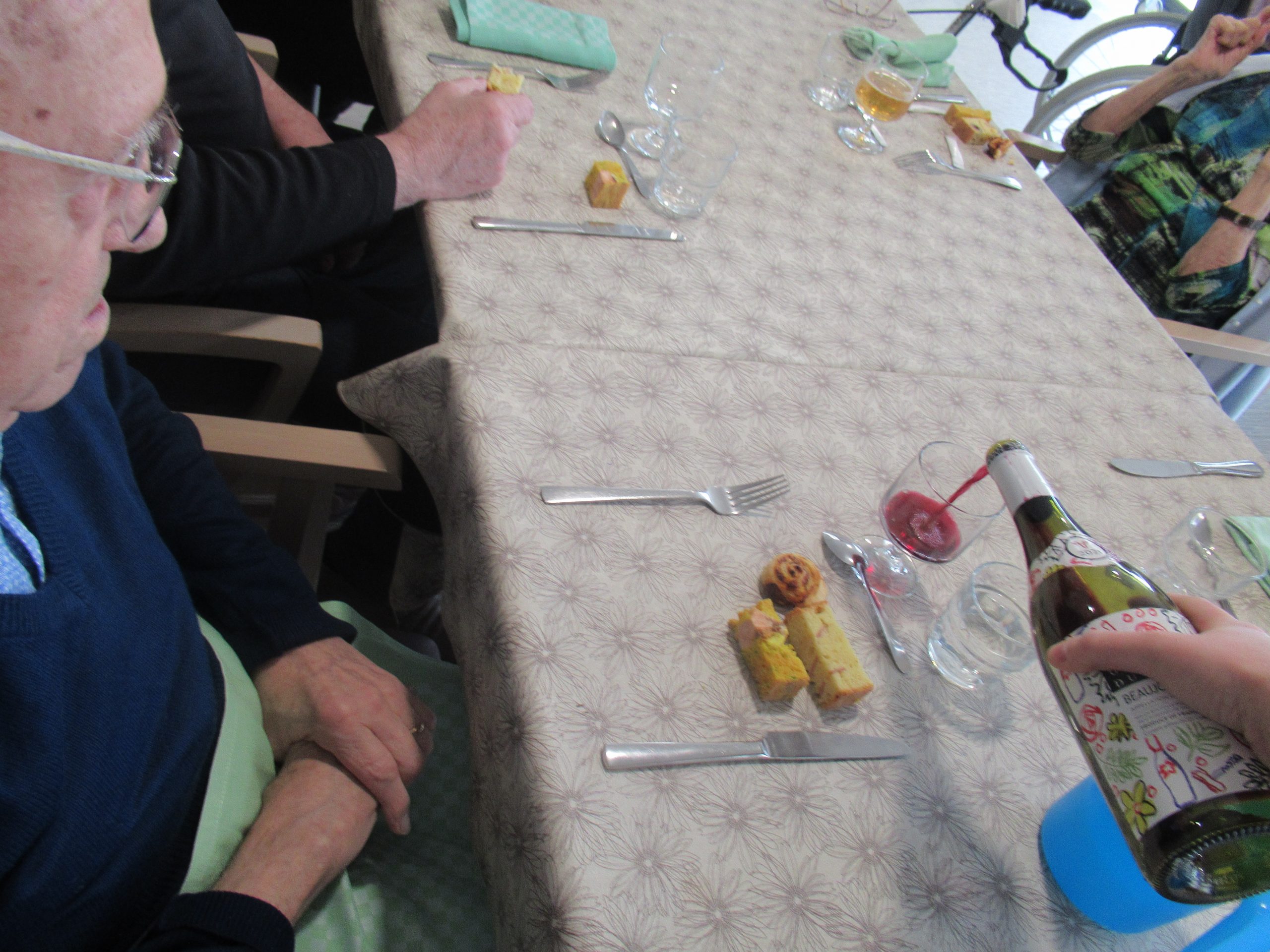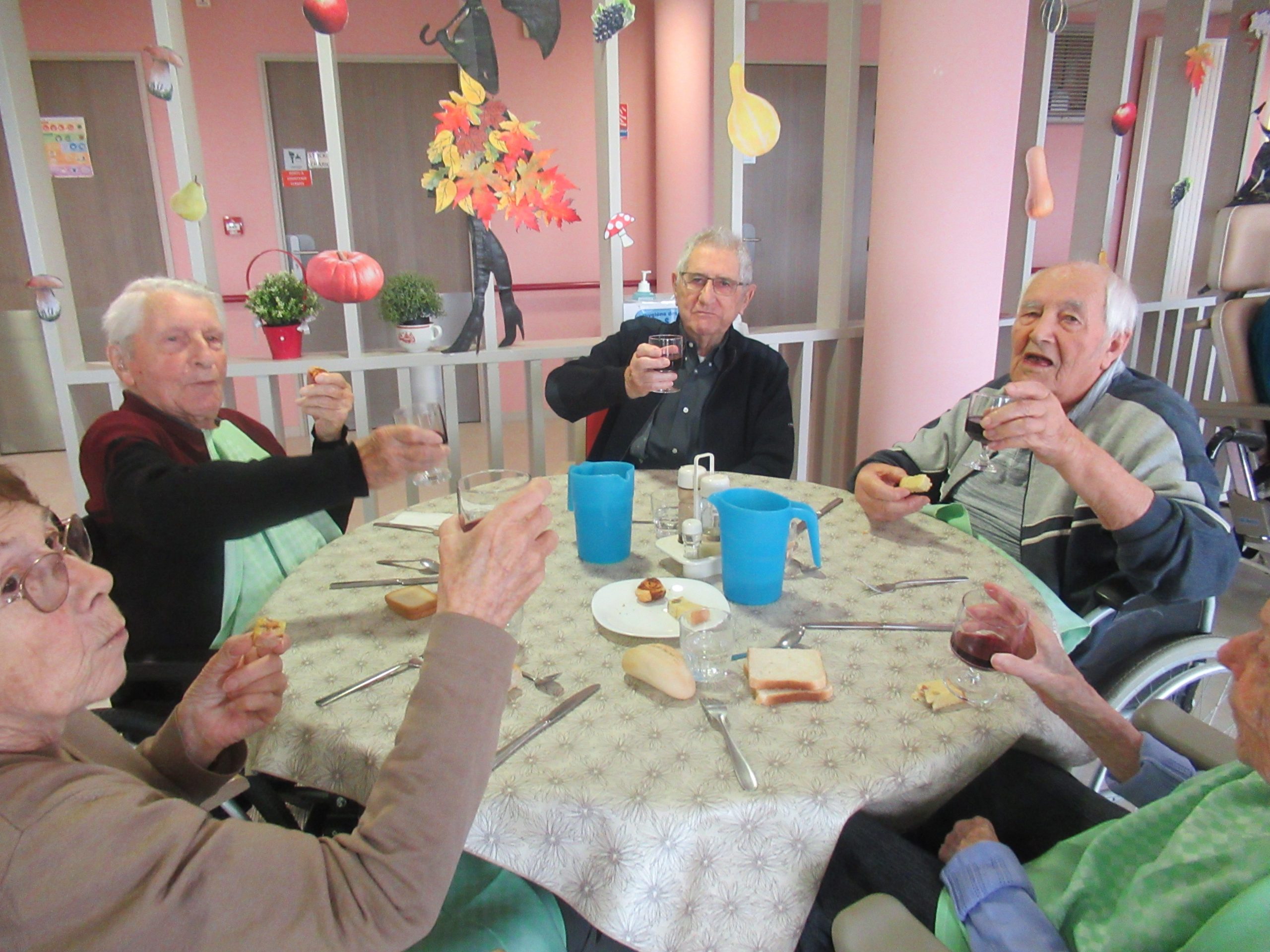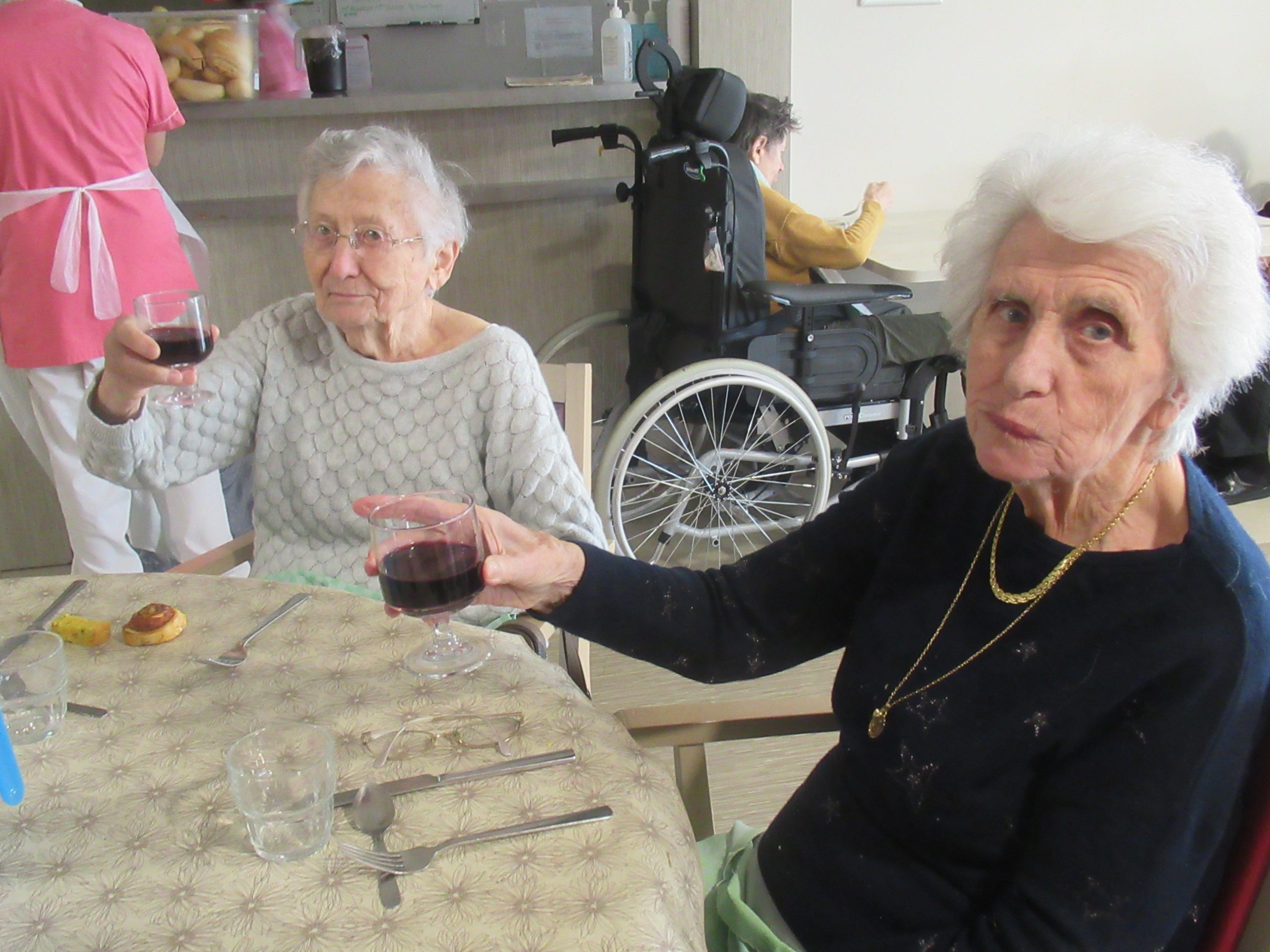 Comme chaque année, le troisième jeudi du mois de novembre, les résidents ont eu droit à un petit apéritif à base de beaujolais nouveau. Ils ont trinqué, le précieux liquide rouge dans le verre. Pour l’occasion le cuisinier avait préparé des petits cakes pour la mise en bouche.