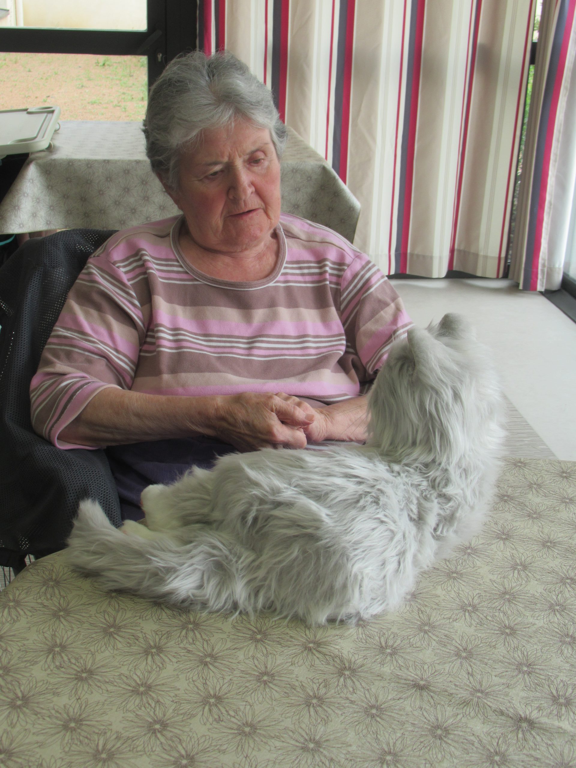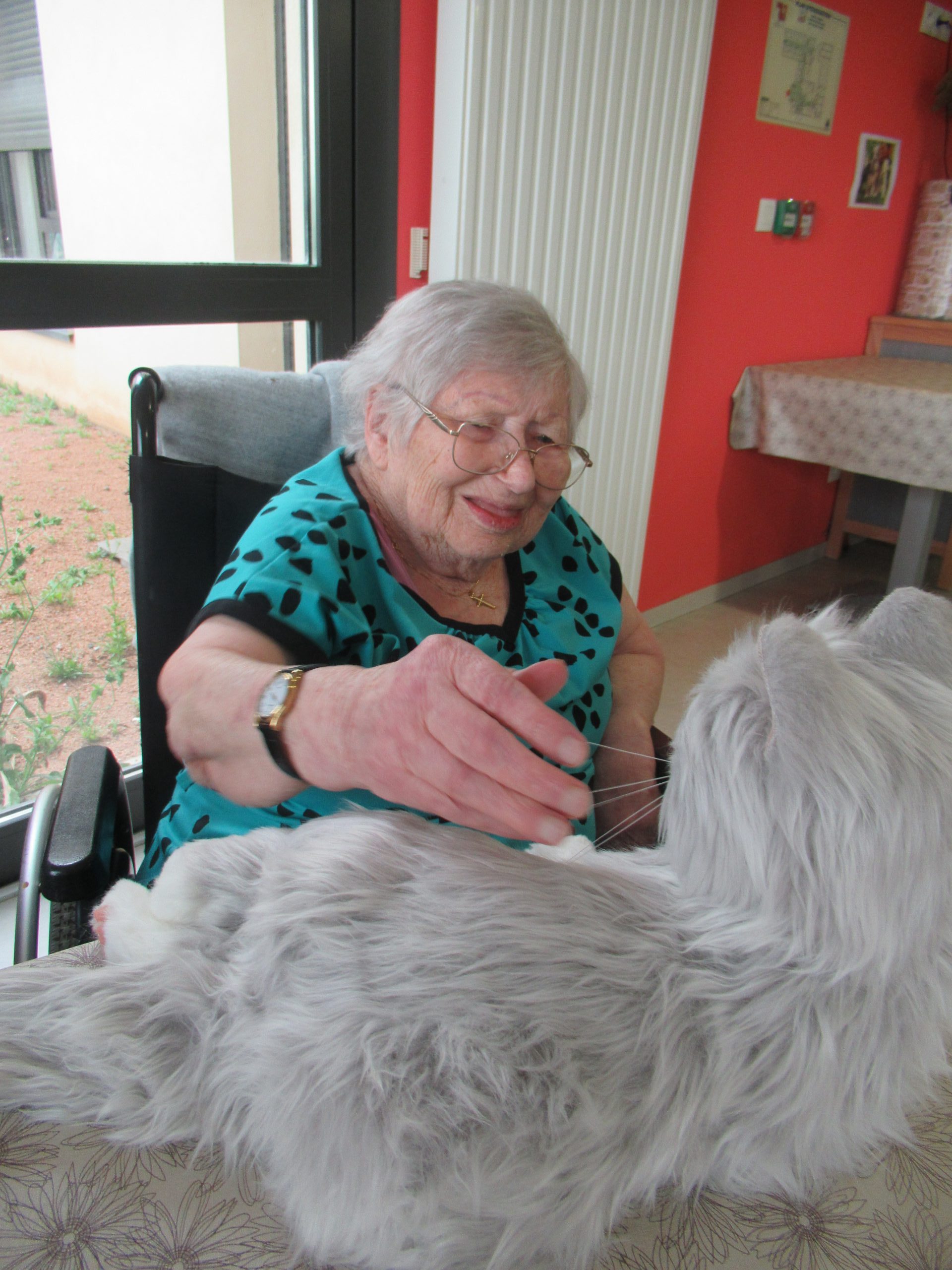 Depuis quelques mois, nous essayons de nouvelles activités à but thérapeutique. A l’unité spécialisée, nous avons proposé aux résidents la présence d’un « chat ». Il ne s’agit pas d’un véritable animal, ce qui serait beaucoup trop contraignant et demande une véritable réflexion autour du bien-être de l’animal. Ce chat est en réalité un robot, conçu spécifiquement pour les personnes âgées présentant des troubles cognitifs et surtout dans le développement des approches non-médicamenteuses.
