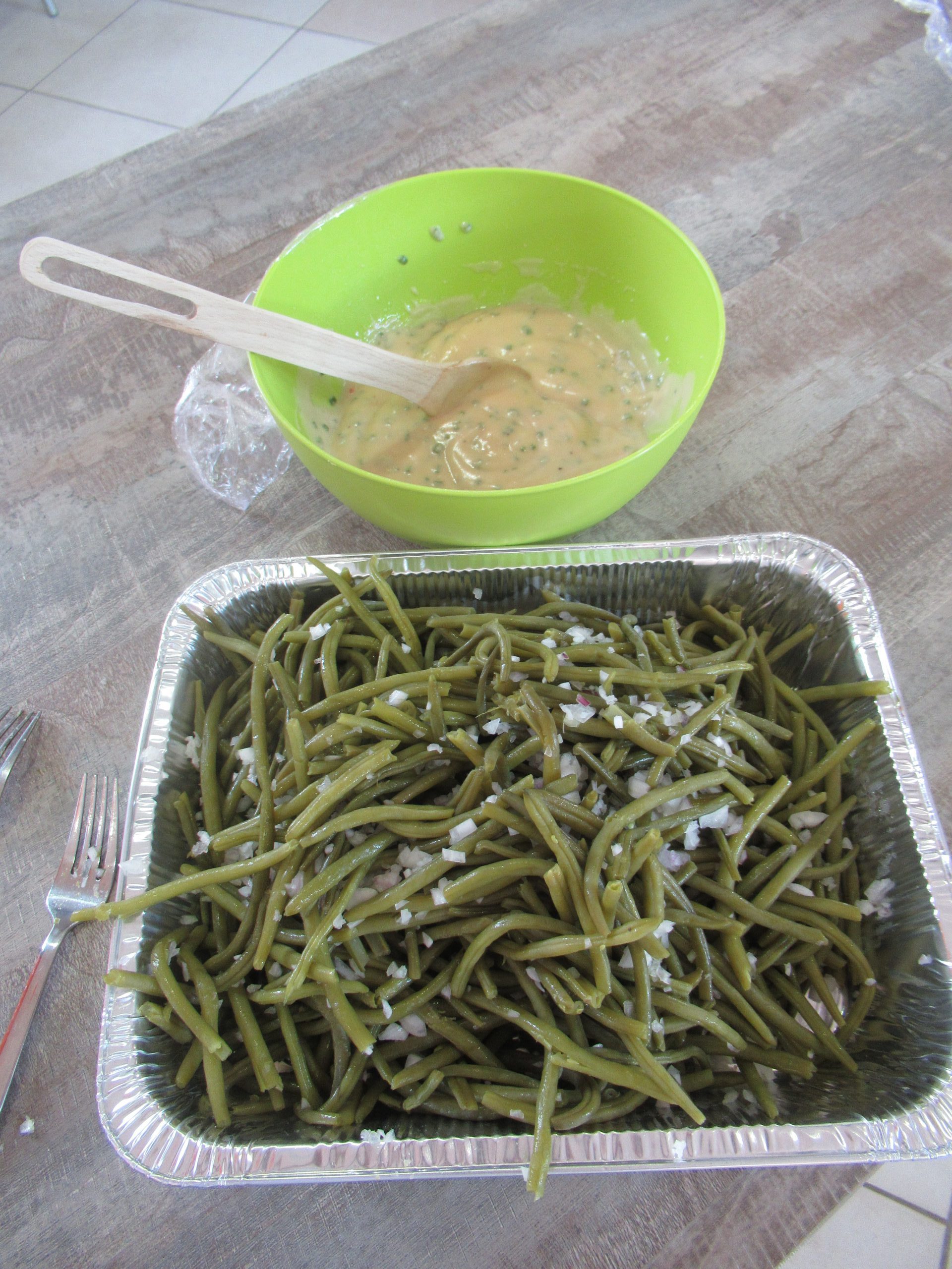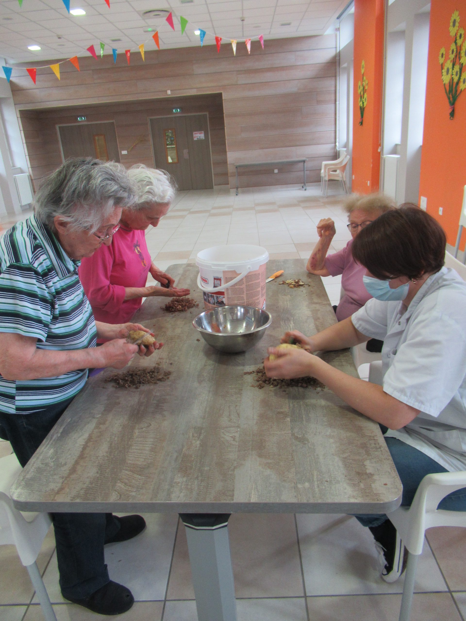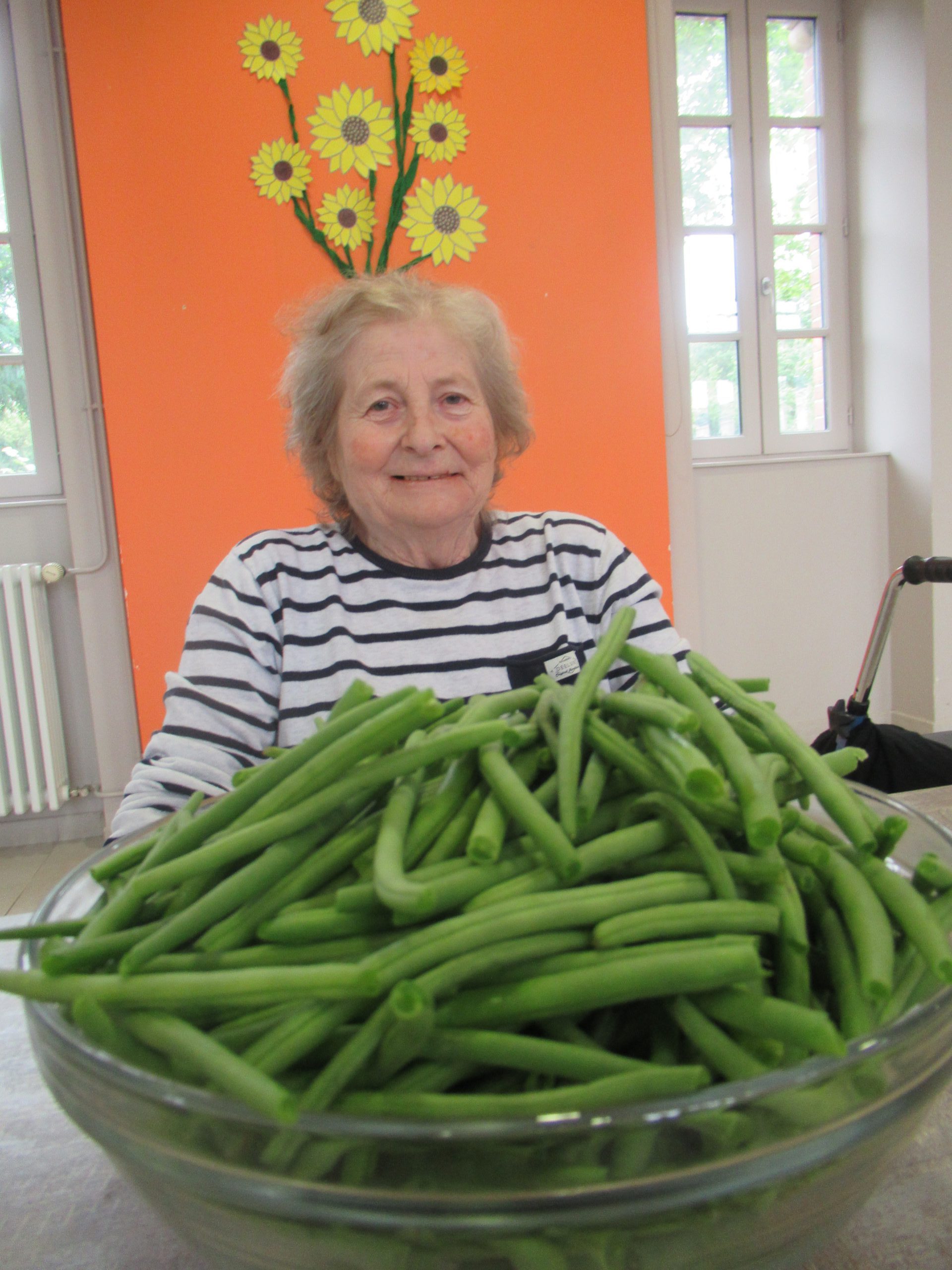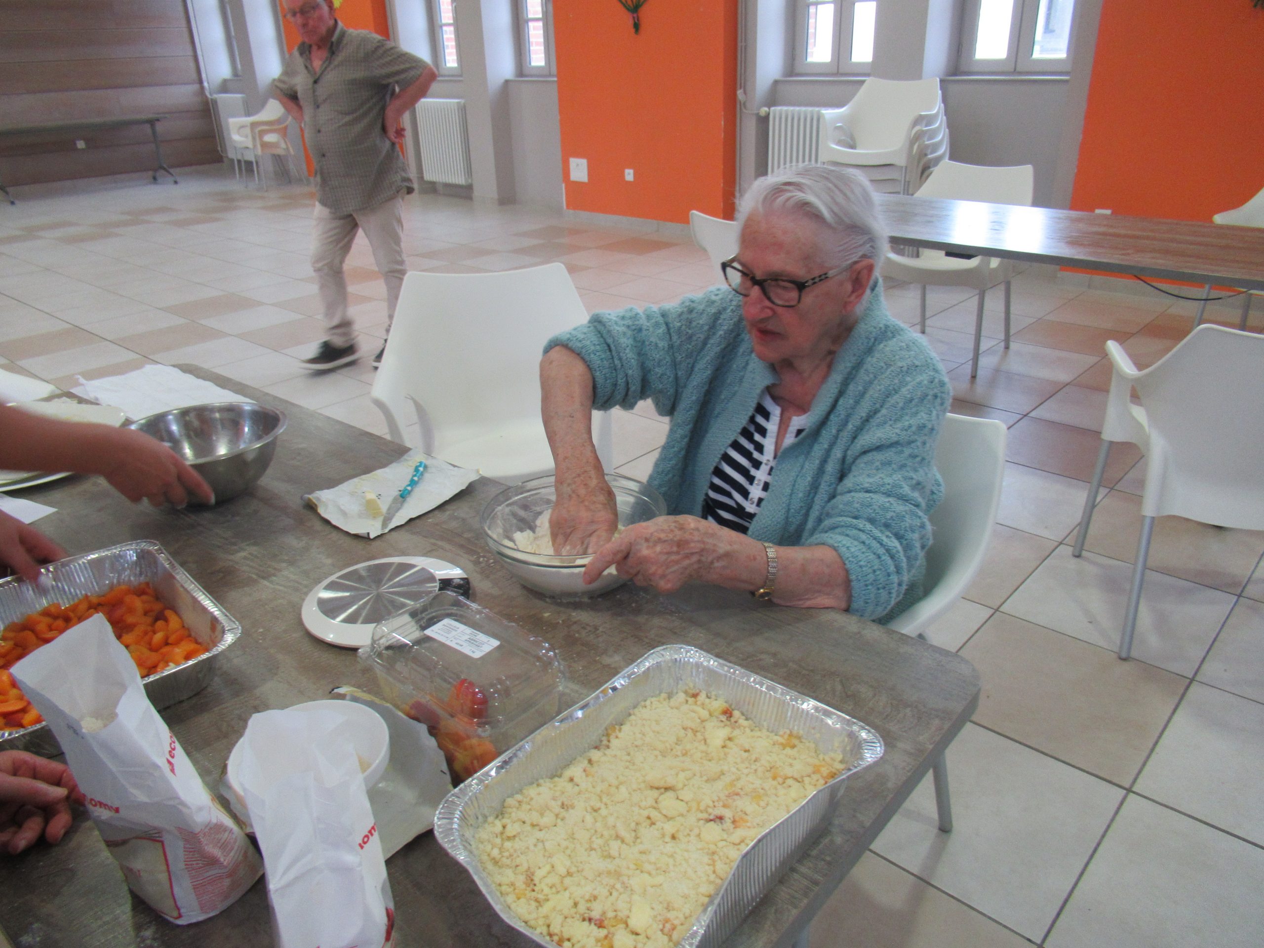 Au programme, musique et petit festin cuit au barbecue. « L’atelier cuisine » de l’après-midi a permis de préparer des haricots verts frais (effilés par les résidents) pour les déguster en vinaigrette, en entrée. Puis, les cuisiniers du jour ont préparé des brochettes de viande, mêlant bœuf, tomates et poivrons que nous avons cuites au barbecue, ainsi que des pommes de terre cuites elles dans les braises. Pour le dessert, deux crumbles ont été réalisés aux fruits de saison : l’un aux pêches, l’autre aux abricots. Servi avec une boule de glace à la vanille, ce dessert a conquis les papilles des convives.