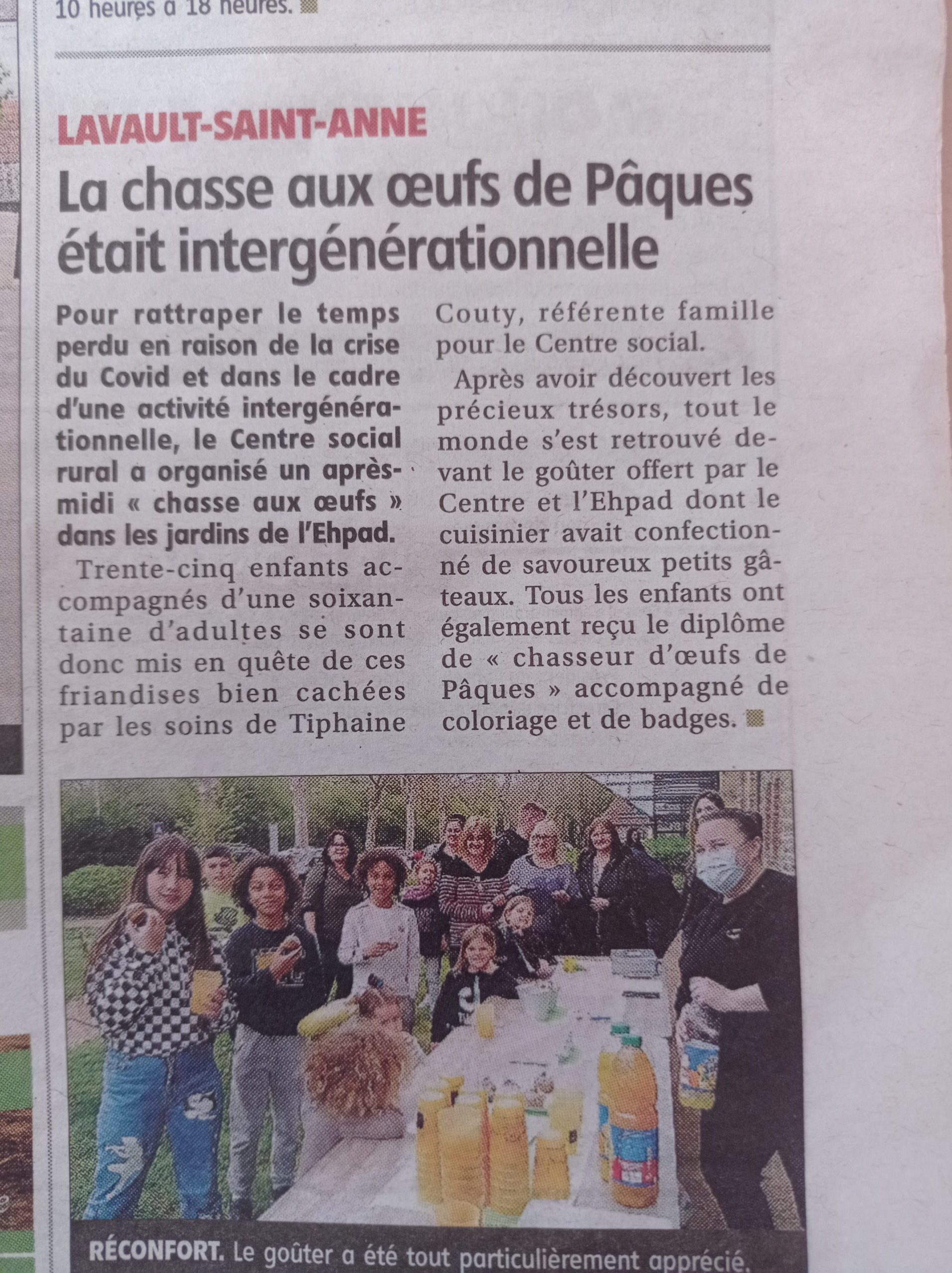 Dans le cadre d’un projet intergénérationnel et pour que personnes âgées et enfants puissent enfin reprendre contact après 2 ans de séparation dus au covid, les animatrices (du centre social d’une part et de l’Ehpad d’autre part) avaient pensé une vaste chasse aux oeufs dans les jardins de l’EHPAD le mercredi 13 avril.